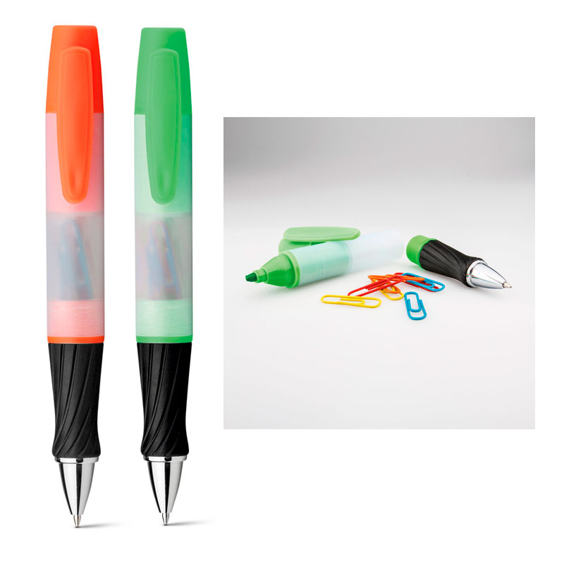Características: Bolígrafo 3 en 1 con escritura azul, rotulador para resaltar texto y compartimento con 8 clips de oficina de colores. Dimensiones de 18 x 149 mm